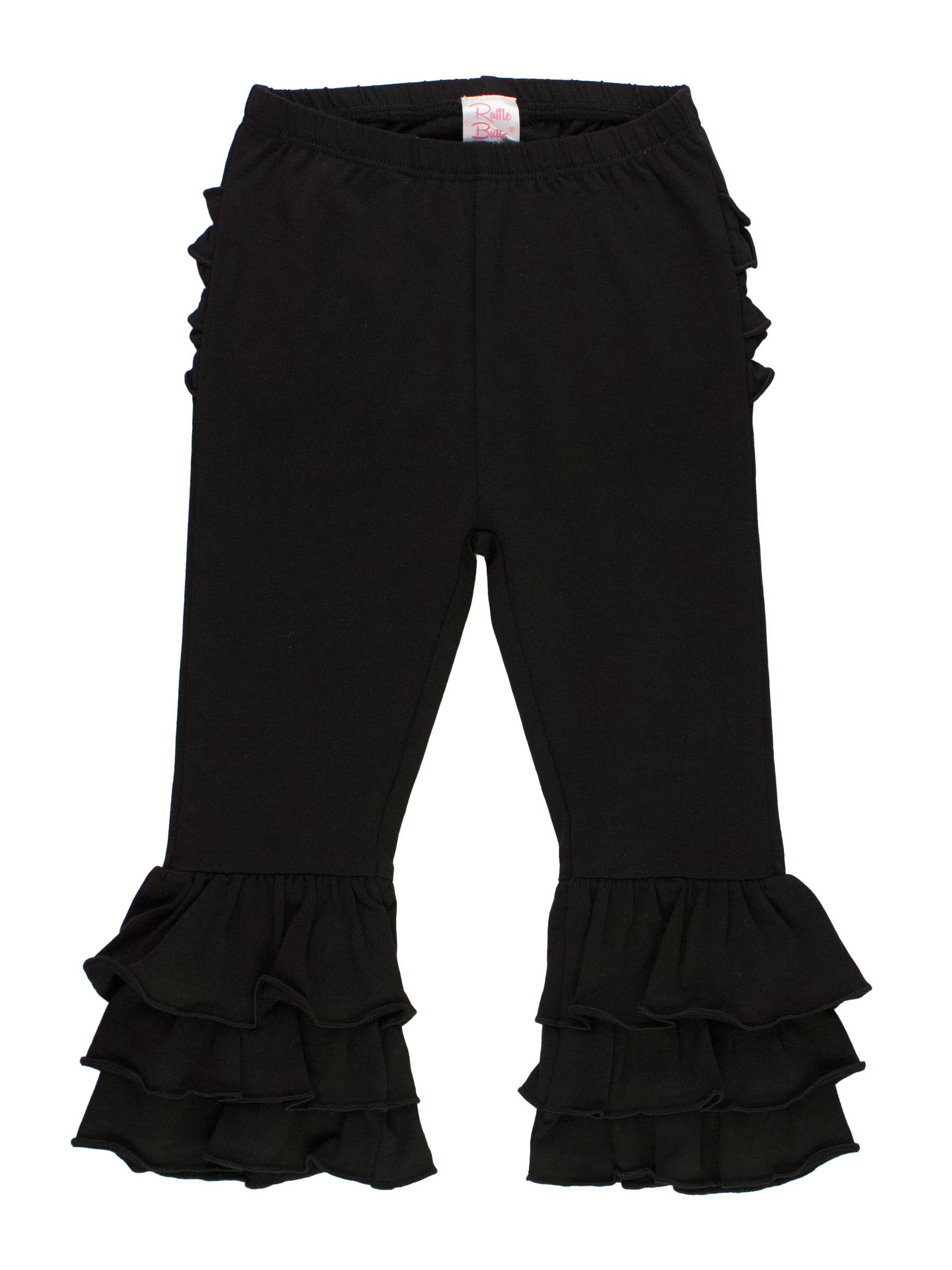 These sweet flared ruffle pants are a RuffleButts classic for a reason! 3 full tiers of ruffles at the ankle make these a statement piece that any little girl will love to wear. Premium, soft knit fabric ensures all-day comfort. Signature rear ruffles add a girly touch! The simple black color makes it easy to coordinate and create a beautiful outfit.