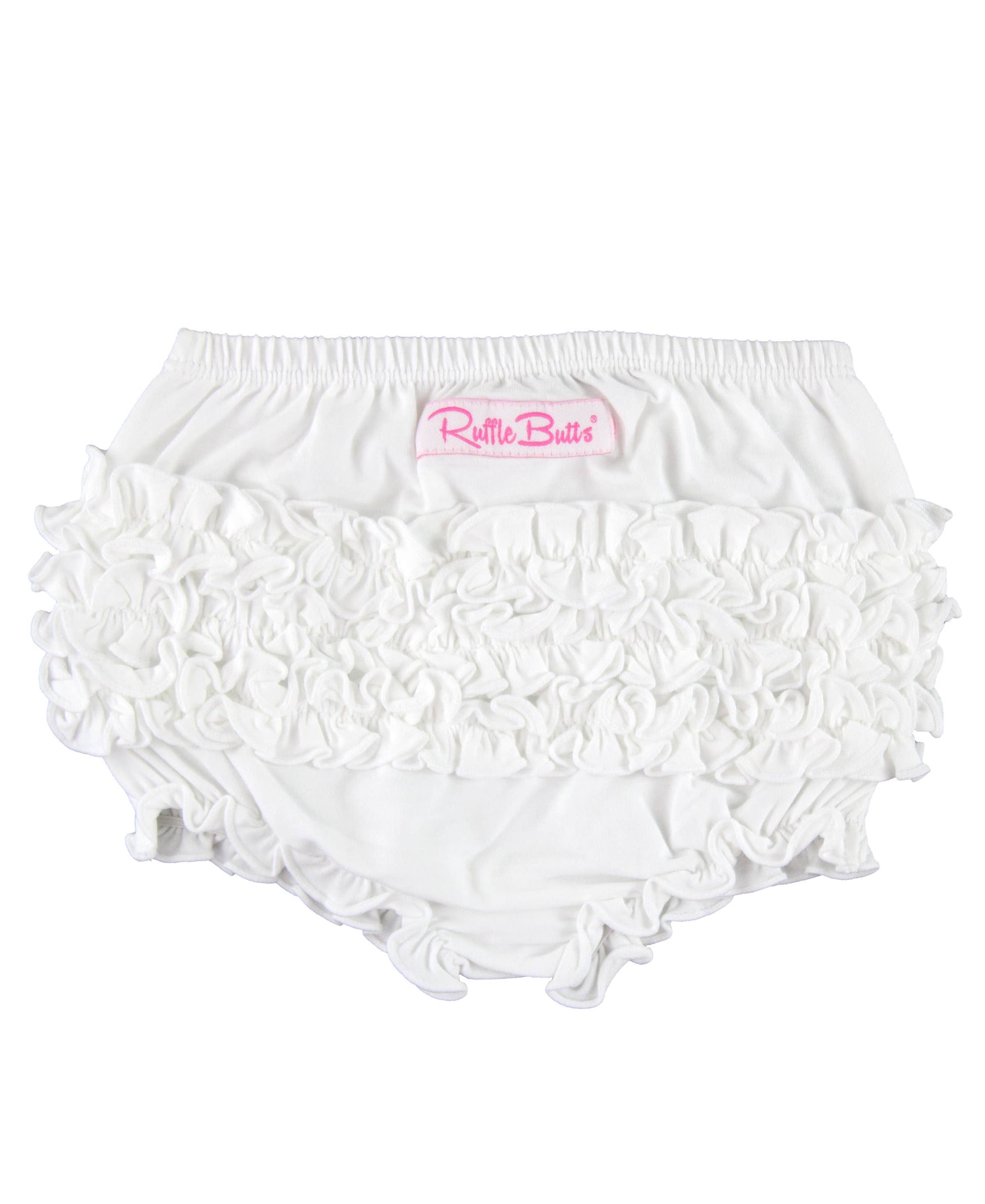 The signature rear ruffles on our classic RuffleButts really sets this baby girl bloomer apart from the rest! With ruffles, an elastic waistband and leg openings, this baby diaper cover is perfect for pictures or just a day at the park. The simple white color makes it easy to coordinate and create a beautiful outfit.