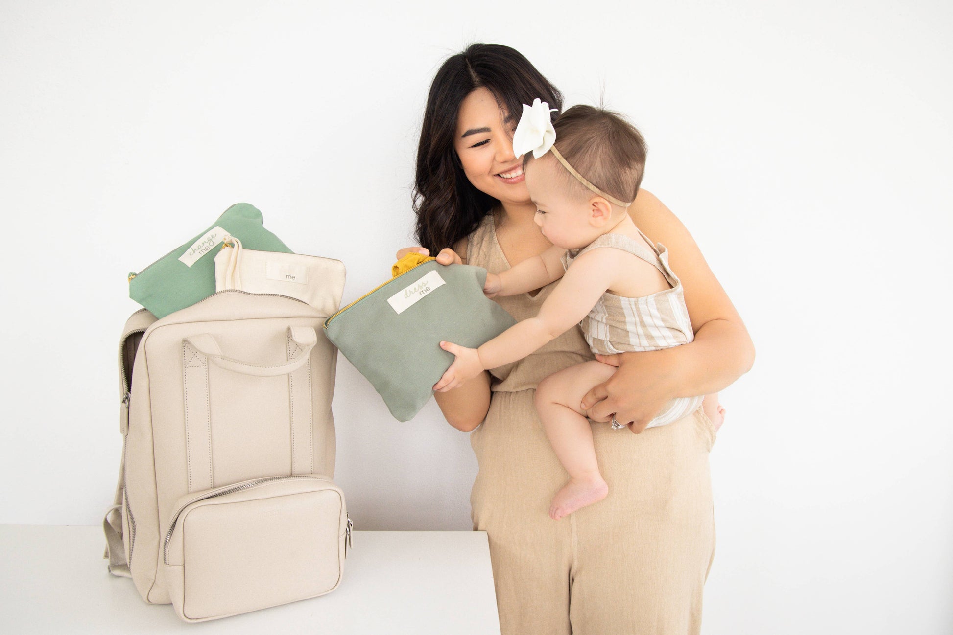 - Stay Organized: Keep your essentials and baby's must-haves neatly organized in 3 dedicated pouches - labeled "Feed Me," "Change Me," and "Dress Me” in modern muted green and neutral cream colors
