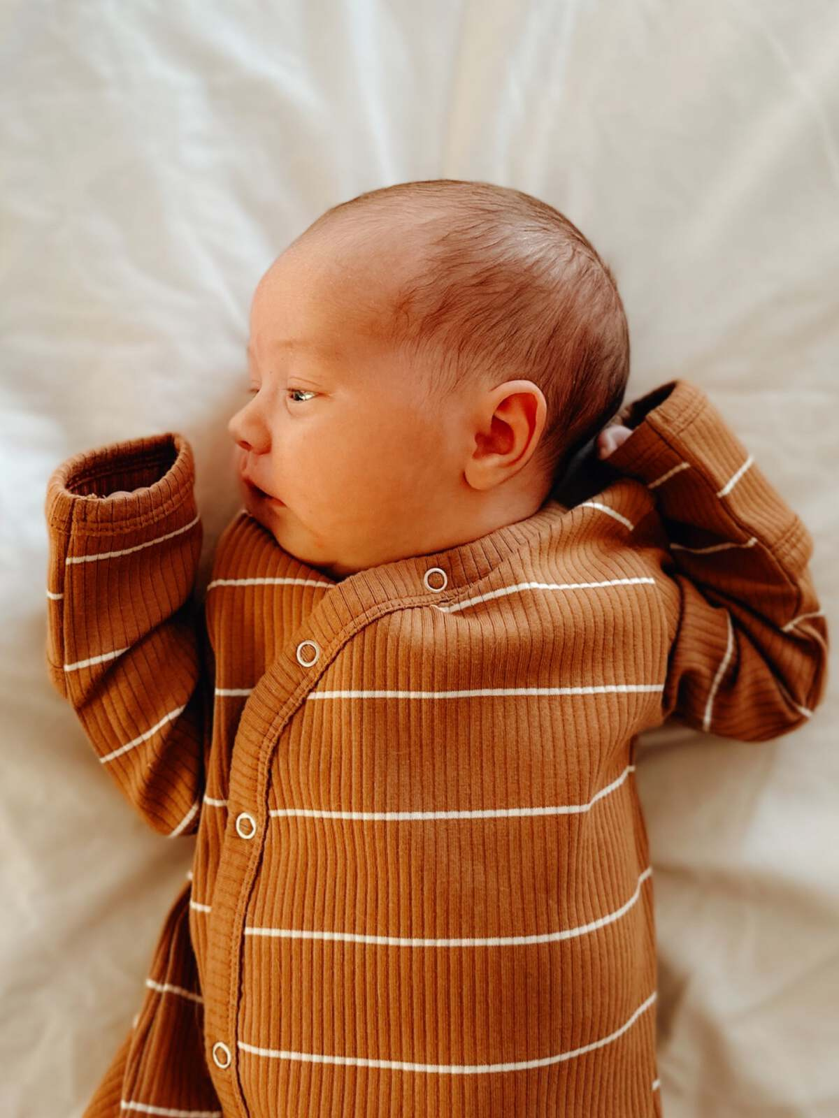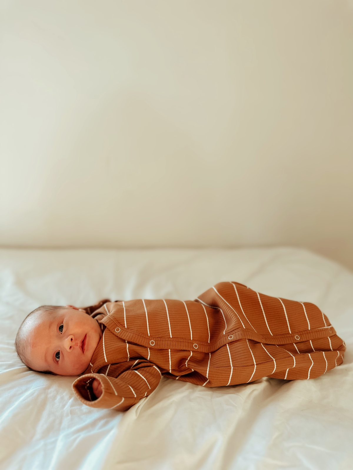 Newborns can grow with this gown, and parents love how easy diaper changes are. Features side snaps and built-in mitten cuffs