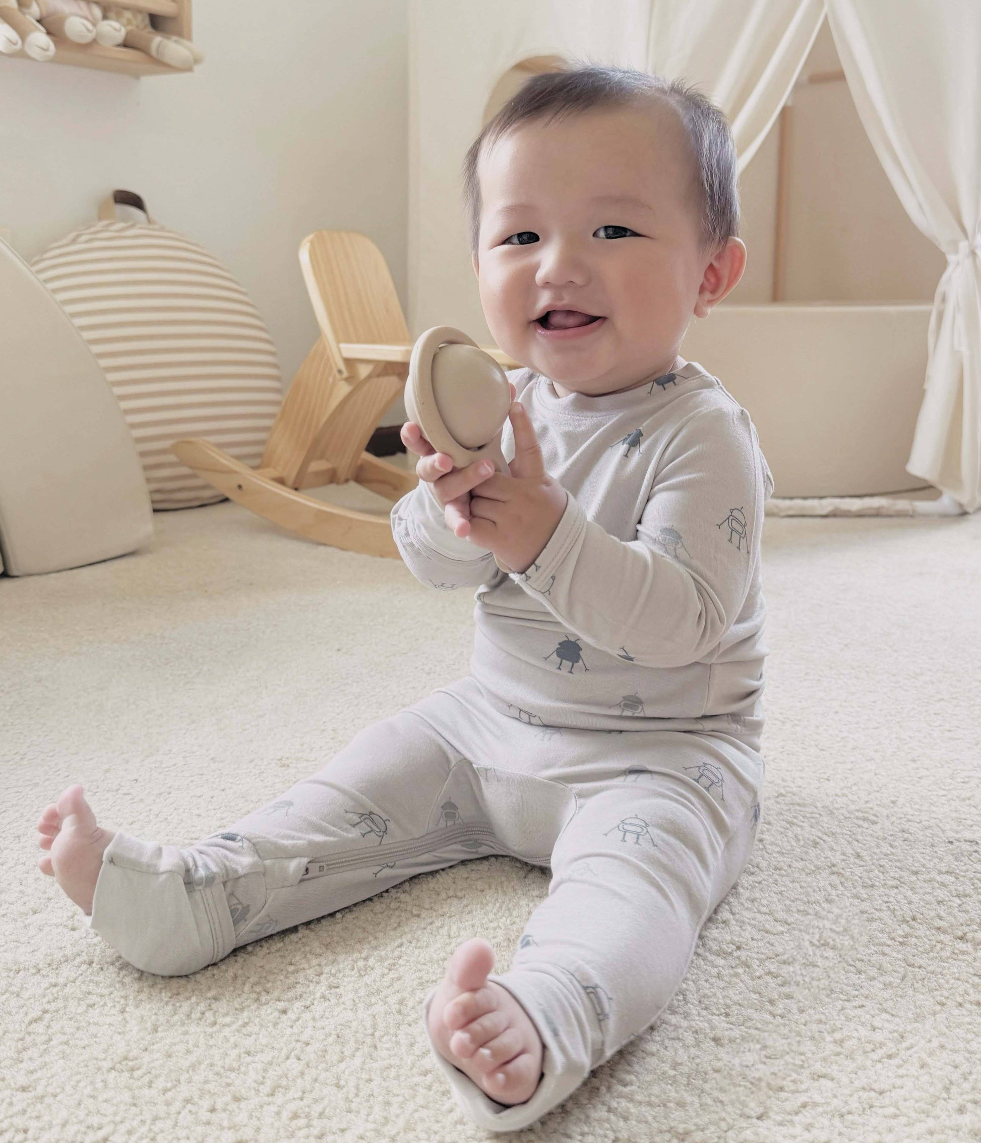 This cozy two-piece footie pajama set for babies is made from soft, breathable bamboo fabric, ensuring comfort and warmth. The adorable design features a snug-fitting top and footed bottoms, perfect for keeping little ones cozy during sleep or play.