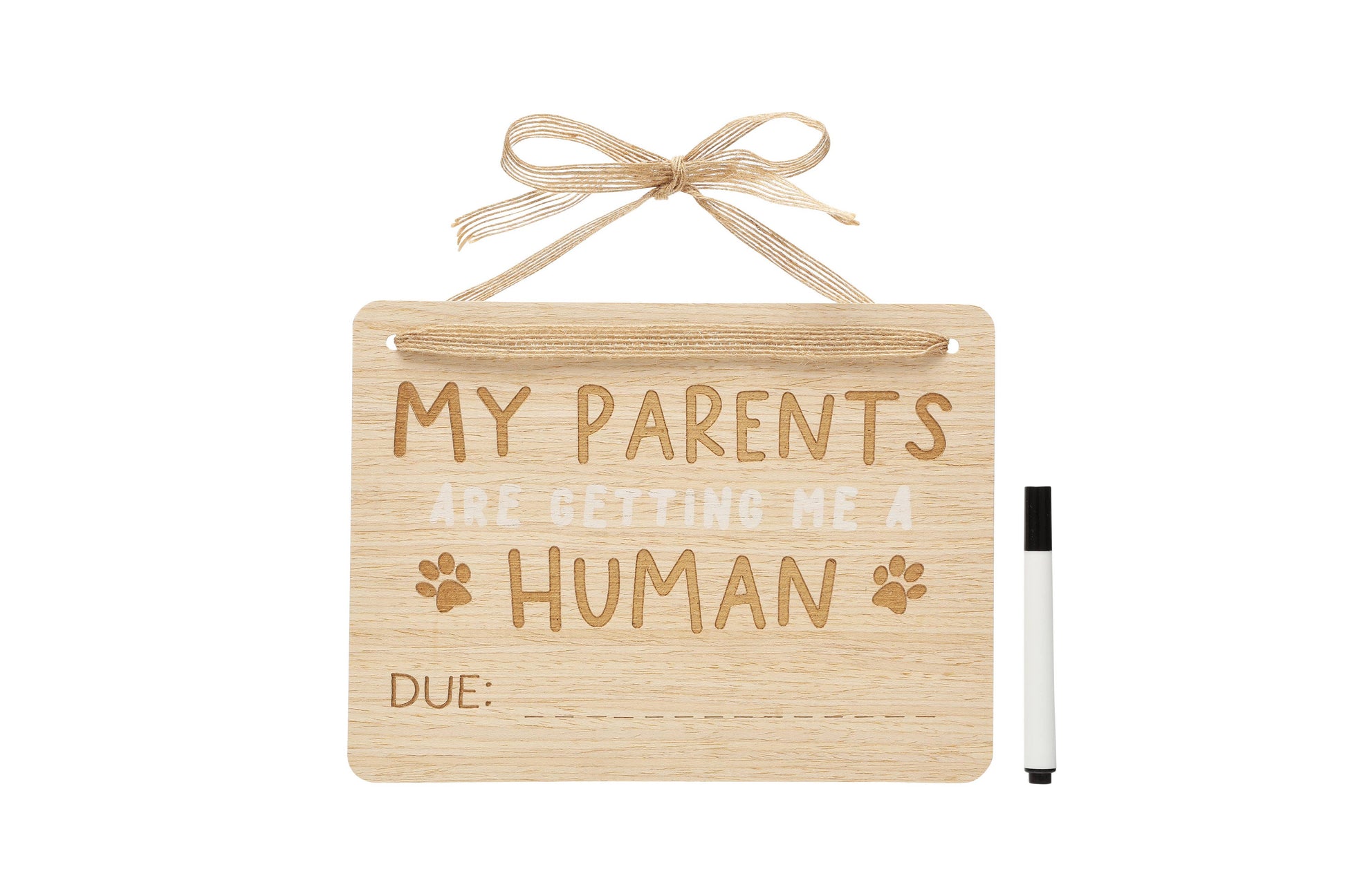 - Includes black marker and wooden sign with burlap bow and hanging string; reads “my humans are getting me a human” with space to personalize this pregnancy announcement with your soon to be baby girl or baby boy’s due date